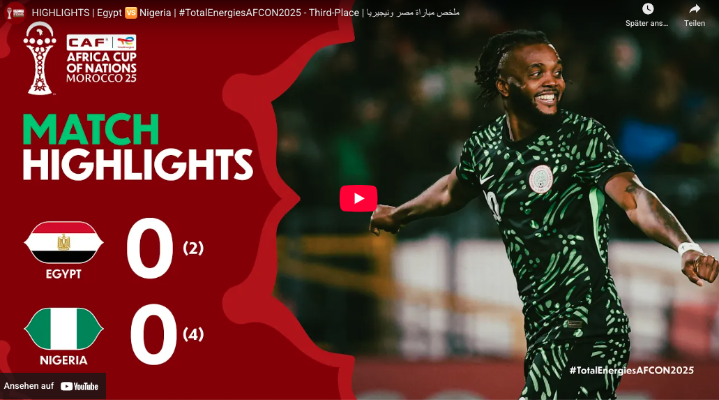 Africa Cup 2025 Video 2025 AFRICA CUP - Third Place - DAY 18 - Egypt vs Nigeria AFRICA CUP 2025 Third-Place DAY 18 Match 51 Egypt vs Nigeria 4:2 17 Jan 2026 afrofootball Related countries Egypt Nigeria Related articles Stars in Europe - Keyplayer - Nigeria - Victor Osimhen Stars in Europe - Keyplayer - Egypt - Mo Salah 2025 AFRICA CUP - Semi-Finals - DAY 17 - Nigeria vs Morocco 0:4 2025 AFRICA CUP - Quarter-Finals - DAY 16 - Algeria vs Nigeria 0:2 2025 AFRICA CUP - Last Sixteen - DAY 13 - Nigeria vs Mozambique 4:0